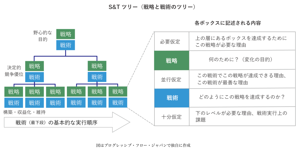 いろいろと検討しましたが、なかなかお手本になるようなものがありません。ただ、自分なりに本質を突き詰めていく中で、戦略、戦術、前提をつなぐ構造化されたフレームワークが不可欠だという結論に達しました。そこで活用したのが、TOCにおけるS&Tツリー(戦略と戦術のツリー)(*)の考え方です。